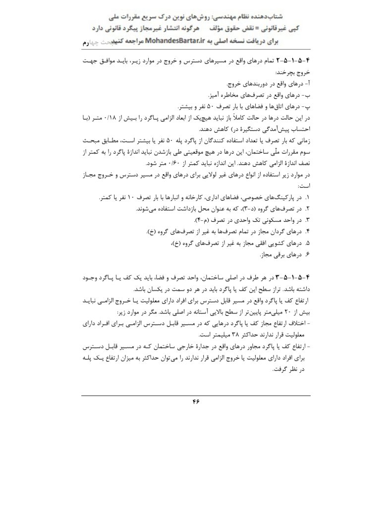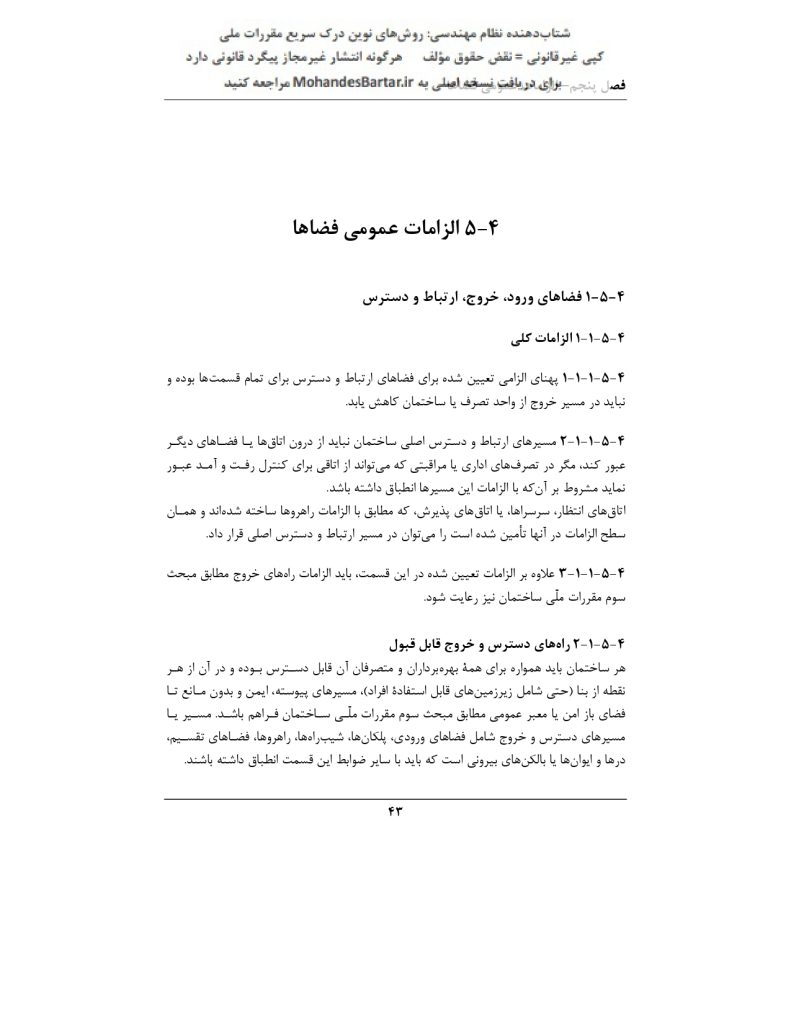 ✅ پاسخ: بر اساس بند ۲-۱-۵-۴ صفحه ۴۳، این مسیرها شامل فضاهای ورودی، پلکانها، شیبراهها، راهروها، فضاهای تقسیم، درها و ایوانها یا بالکنهای بیرونی است. 🏢