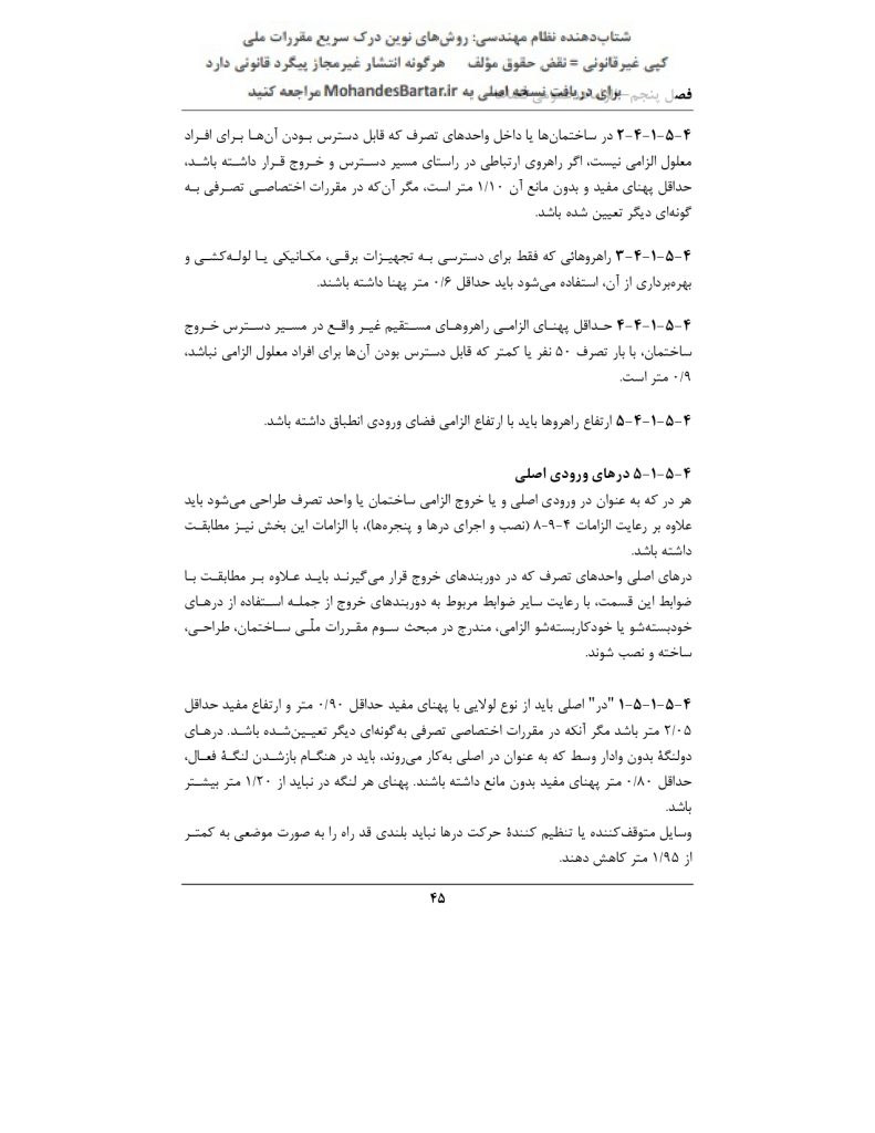 ✅ پاسخ: بر اساس بند ۳-۴-۱-۵-۴ صفحه ۴۵، حداقل پهنا برای این راهروها ۰/۶۰ متر (۶۰ سانتیمتر) است. ⚡