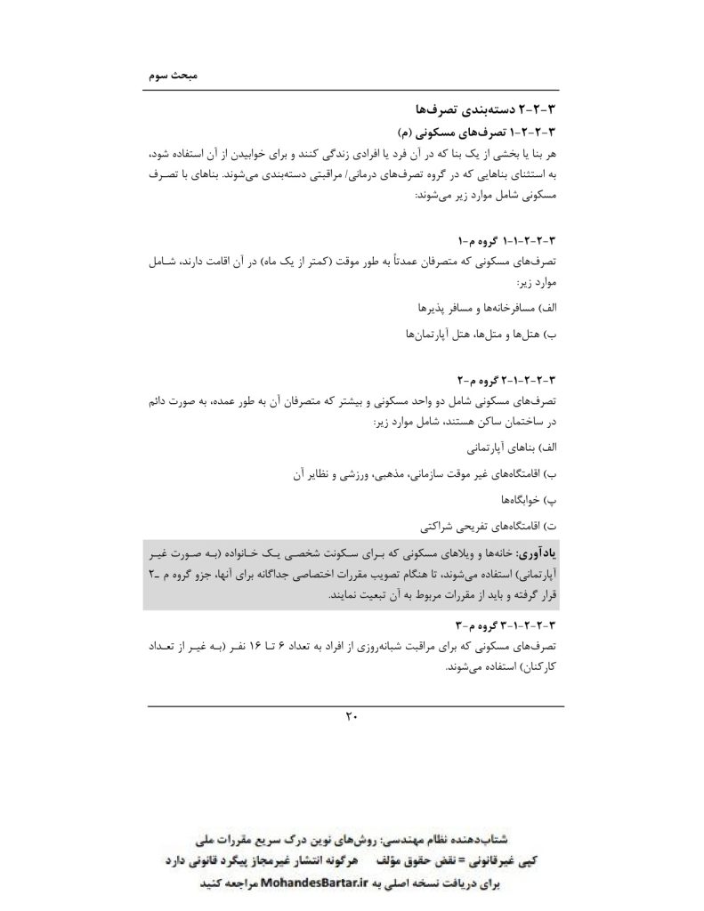 🏠 گروه تصرف مسکونی (M1): مختص ساختمانهایی با ویژگی سکونت دائمی است، مانند آپارتمانها، خوابگاهها و اقامتگاههای تفریحی شراکتی.