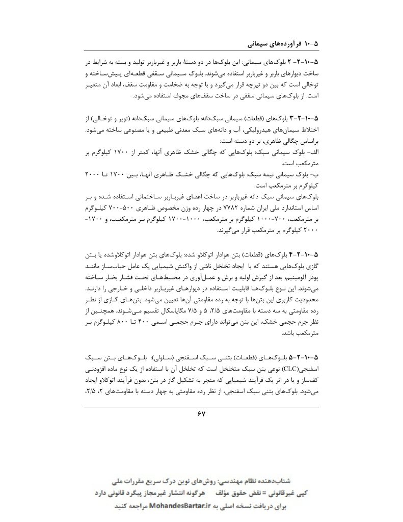 ✅ بر اساس بند ۳-۲-۱۰-۵ صفحه ۶۷، این بلوک‌ها از اختلاط سیمان‌های هیدرولیکی، آب و دانه‌های سبک معدنی طبیعی یا مصنوعی ساخته می‌شوند.