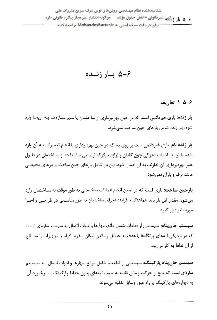 بند ۱-۵-۶ صفحه ۲۱: بار غیردائمی واردشده در حین بهره‌برداری از ساختمان (غیر از بارهای حین ساخت).