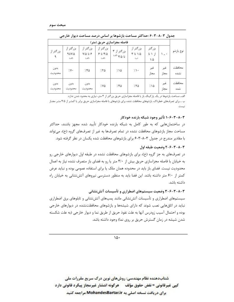 - ✅ حداقل فاصله عمودی بین بازشوهای طبقات مجاور: ۹۰ سانتیمتر (برای جلوگیری از پیشروی عمودی آتش).