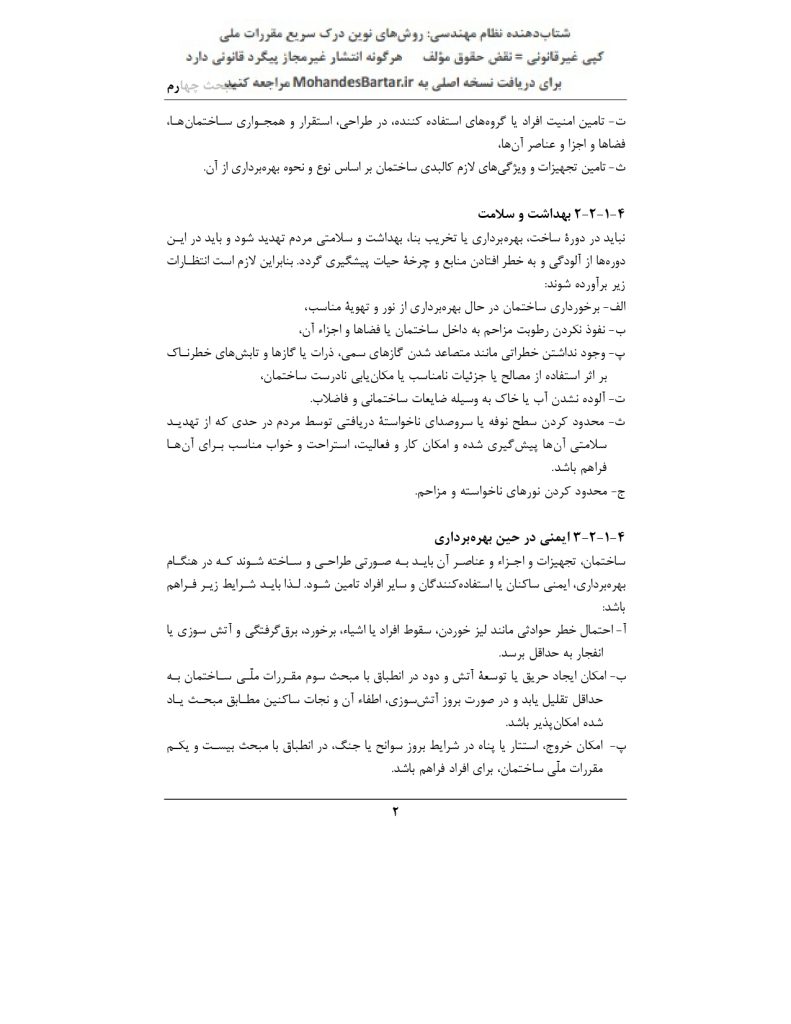 📌 بر اساس بند ۲-۲-۱-۴، حفظ بهداشت و سلامت مردم در تمام مراحل عمر ساختمان (ساخت، بهرهبرداری و تخریب) یک اصل غیرقابل چشمپوشی است. این موارد را شامل میشود: